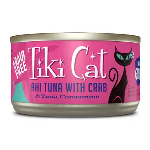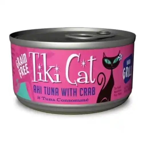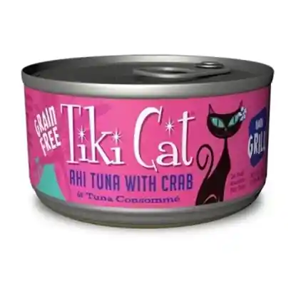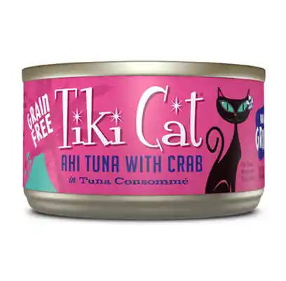 Tiki Cat Gourmet Whole Food Brand Cat Food Hana Luau is shredded Ahi Tuna topped with Crab prepared in Tuna consommรญยฉ for a grain free, gravy free, zero carb meal. Complete and balanced diet for all life stages