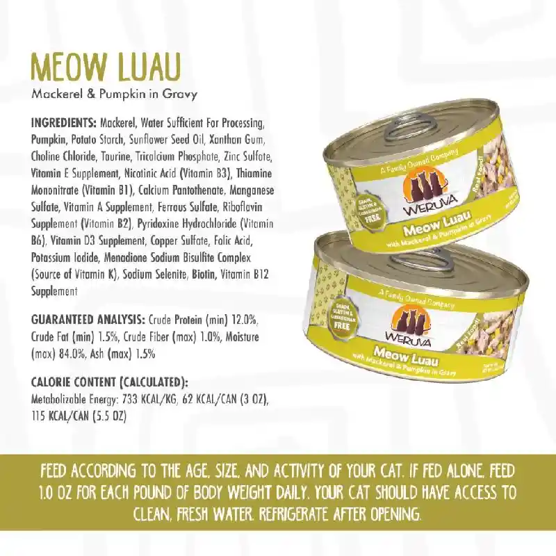 Aloha! Your cat will be cheesing from ear to ear while they hula dance after eating the Weruva Meow Luau With Mackerel and Pumpkin Canned Cat Food. Packed with whole mackerel, pumpkin, and plenty of omega-fatty 3 your cat's coat will be shining and ready to show off to the world. The Weruva Meow Luau With Mackerel and Pumpkin Canned Cat Food is free of grain, msg, GMOs, and carrageenan for any little carnivores who want to stay healthy for their summer trip to Hawaii.