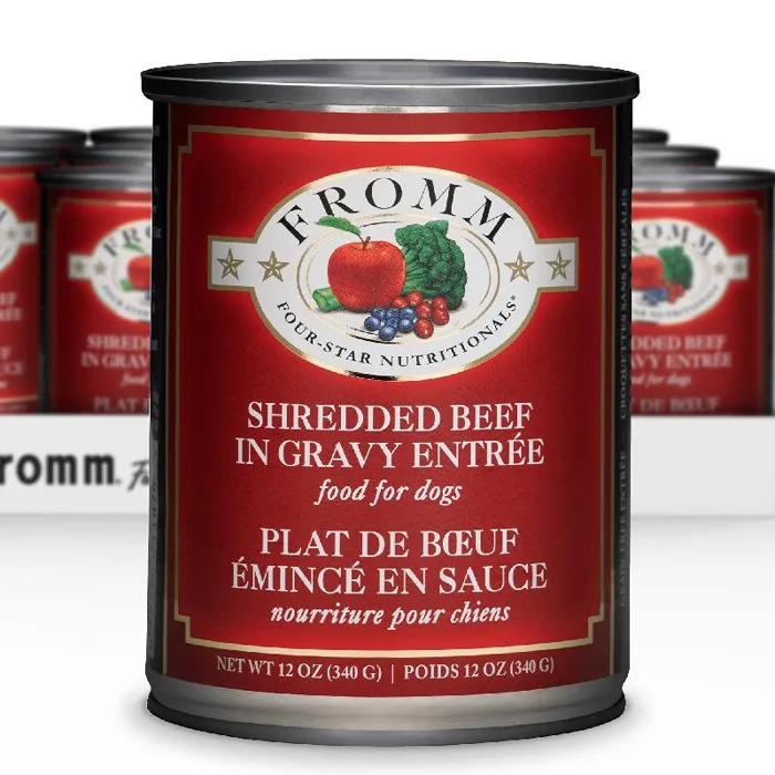 Perfect as a complete meal or accompanying your dog's favorite dry food, Fromm Four Star Shredded Grain Free Beef in Gravy Canned Dog Food provides balanced and complete nutrition for all breeds and all stages of life. This recipe is made with high quality shredded beef paired with potatoes, carrots, and beans cooked together in a beef broth. Fromm Four Star Shredded Grain Free Pork in Gravy Canned Dog Food is grain free and made with no artificial colors, flavors, or preservatives.