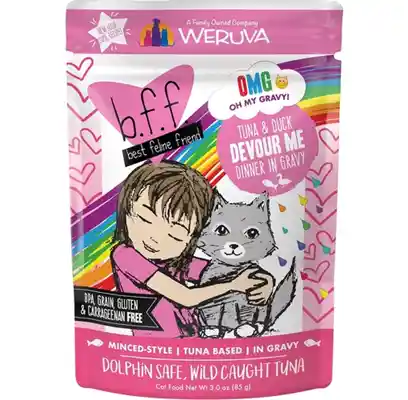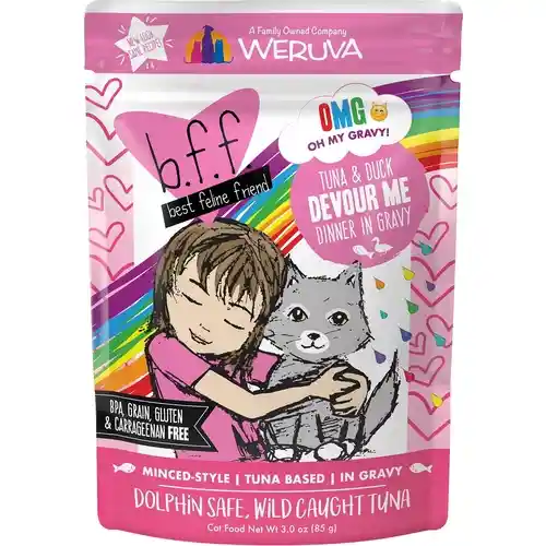 Turn your cat into your BFF with Weruva BFF Tuna and Duck Devour Me Pouches Wet Cat Food. Your cat is guaranteed to devour this wholesome food. With wild-caught tuna and cage-free duck, this food is packed full of protein for a healthy kitty. Weruva products are free of any grains, gluten, starch, and carrageenan for a balanced meal in each can.