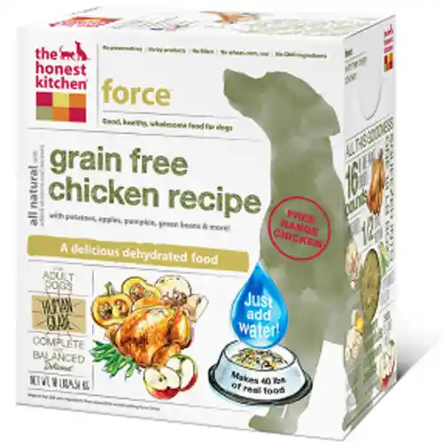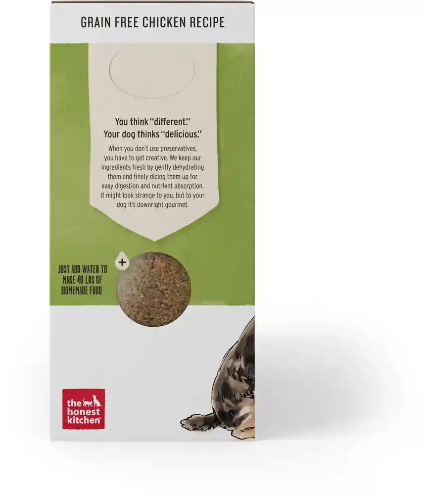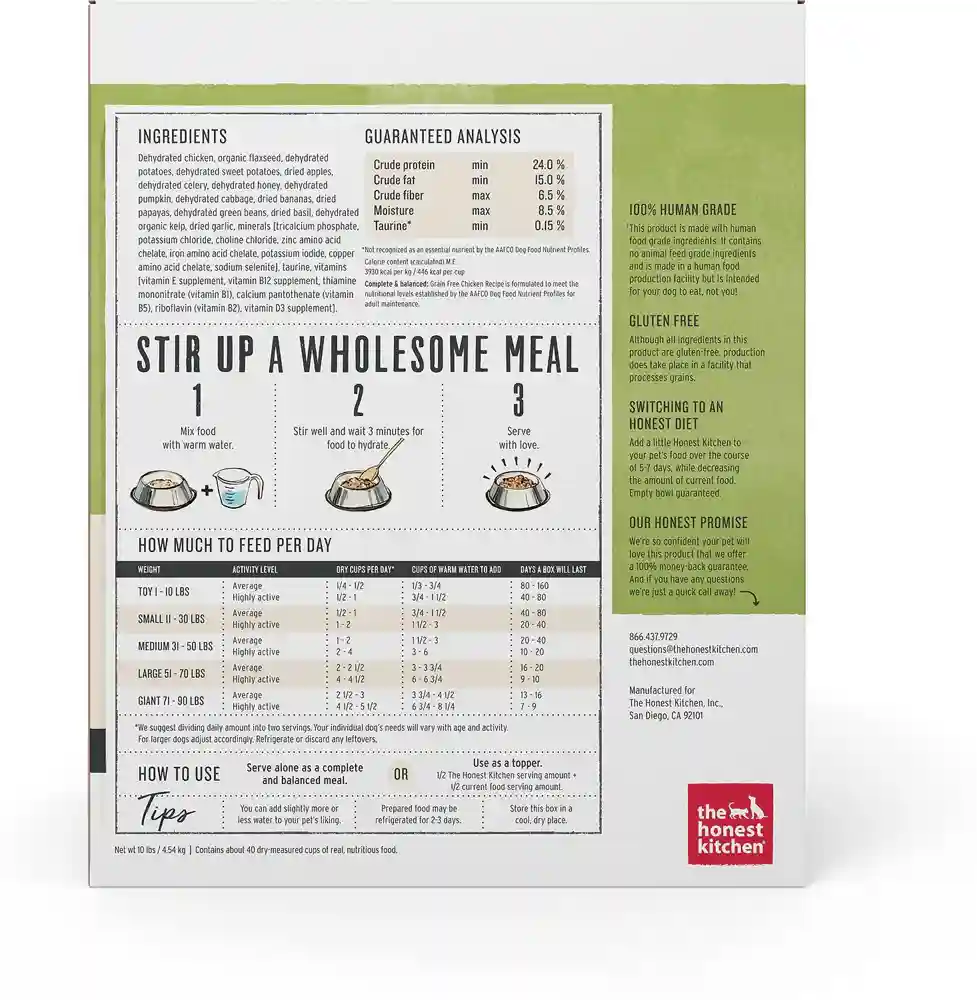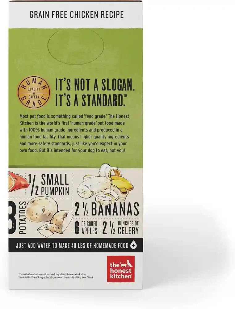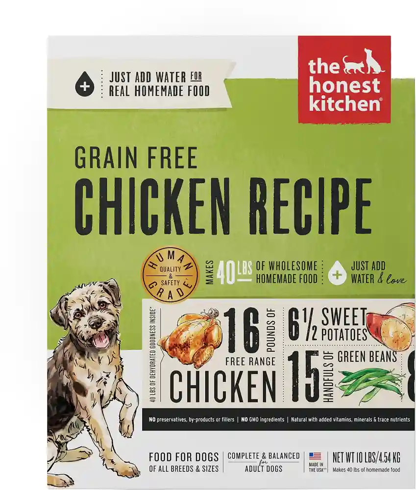 Treat your dog to The Honest Kitchen Grain-Free Chicken Recipe Dehydrated Dog Food - a meal that is both nutritious and delicious! This grain-free dehydrated adult dog food is packed with 100% real free-range chicken and a variety of fruits and vegetables including bananas, de-cored apples, sweet potatoes, green beans, pumpkin and more! Made without corn, wheat or soy, this grain-free formula is paw-sitively perfect for doggos with food sensitivities. With this human grade recipe produced in a human grade facility, Honest Kitchen proves that you don't have to be a human to eat like one!