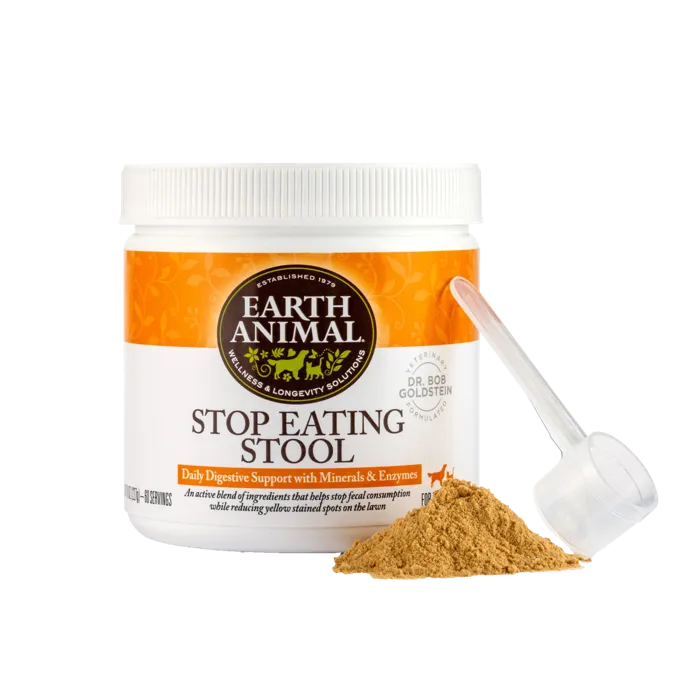 Stop Eating Stool daily supplement is an active blend of nutrients, minerals, and enzymes that offers digestive support and helps stop stool-eating episodes while reducing yellow stained spots on the lawn.