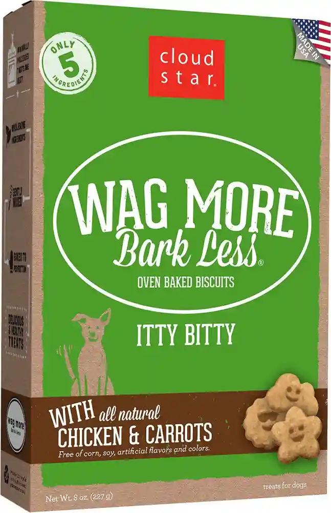 Cloud Star Wag More Bark Less uses only 5 all-natural ingredients in their Itty Bitty Oven Baked with Chicken & Carrots Dog Treats to create the best-quality treats for your tiny canine companion. Mouthwatering ingredients like savory chicken and wholesome carrots are gently mixed and slow-baked to perfection in fun, smiling star, sun and cloud shapes. Theyโre bite-sized for even the teeniest jaws to crunch and made without dairy, corn, soy or white potatoes. So go ahead and indulge your furry friend with a delicious, satisfying treat thatโs only made with the good stuff.