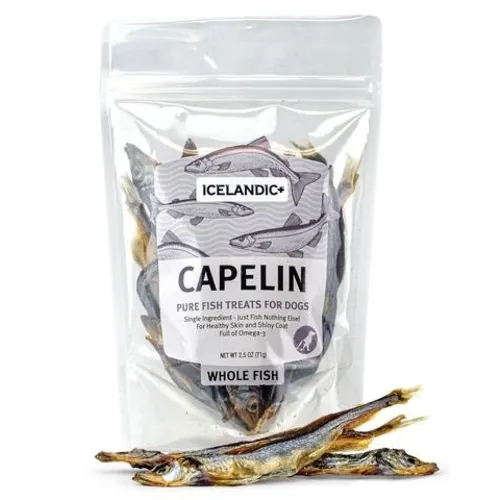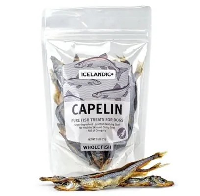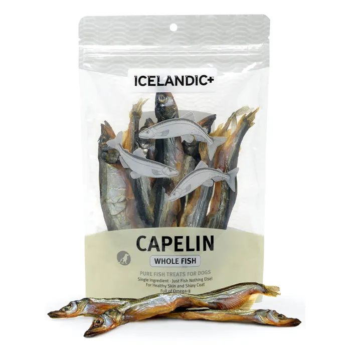 Your dog will love the irresistible taste and satisfying crunch of our nutritious and natural Capelin Whole Fish dog treats, made from one single ingredientโwhole Capelin! They are caught fresh daily in the cold, pure waters of Iceland, and air-dried within FDA, USDA, EU, and MAST standards. Our 100% edible and digestible capelin treats promote healthy skin and coat with Omega-3 fatty acids. They also reduce plaque and tartar build-up, making them good for your dogโs teeth. Plus, since these treats feature a single protein source, theyโre a smart choice for dogs with food sensitivities.