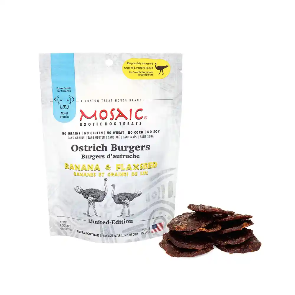 Mosaic Exotic Dog Treats Ostrich Burgers Banana & Flaxseed 4oz