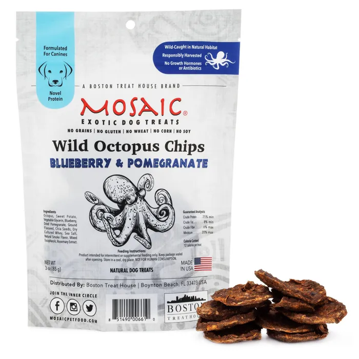 Mosaic Exotic Dog Treats Wild Octopus Chips Blueberry & Pomegraanate 4oz