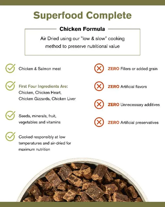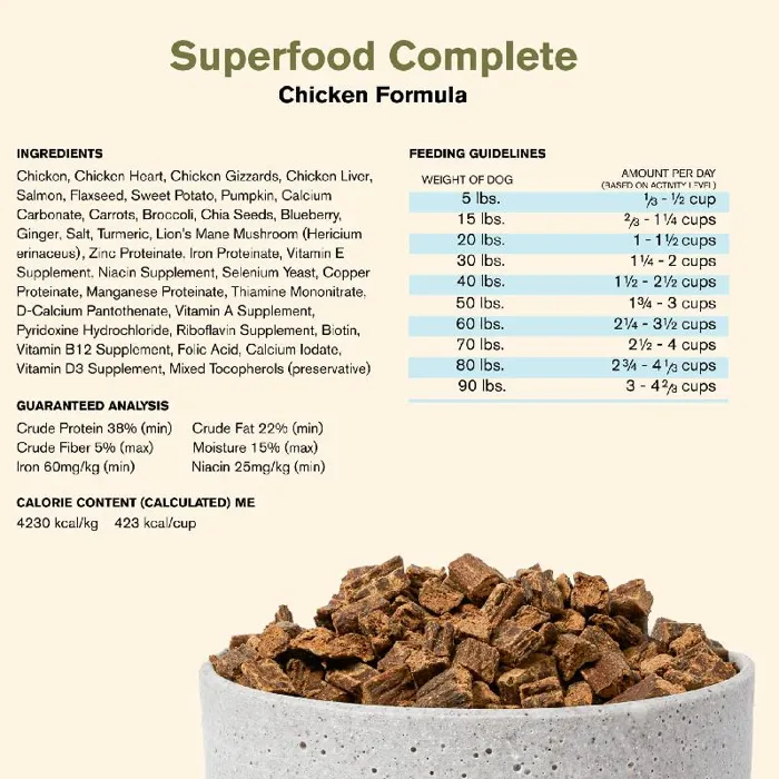 These ingredients are cooked responsibly at low temperatures to deliver maximum nutrition in every tasty bite. Superfood Complete contains no corn, soy, wheat, or fillers — it’s all the good stuff your dog needs to thrive, with none of the bad.