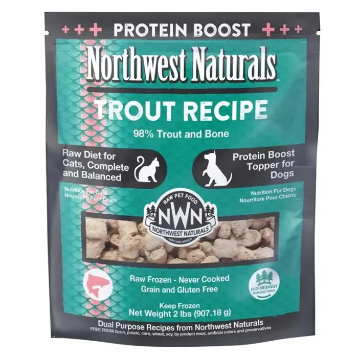 Northwest Naturals Trout Protein Boost is a complete and balanced diet for our feline family and the perfect topper or treat for dogs. The Protein Boost contains never-cooked, minimally processed raw proteins, retaining the integrity of the vitamins, minerals, and enzymes of the natural whole food.