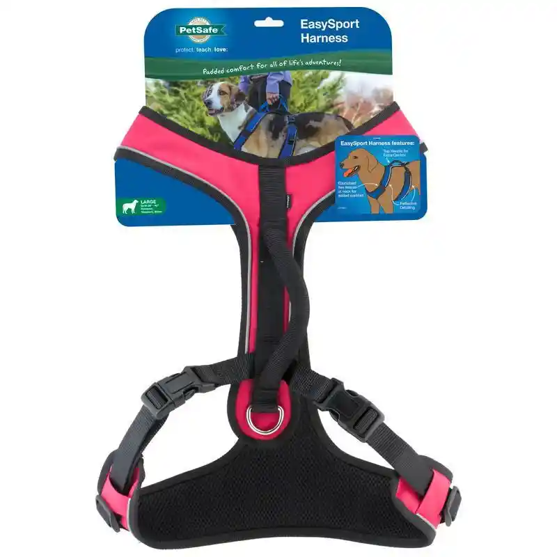 Give your dog comfort and style with the PetSafeยฎ EasySport Dog Harness. The fully adjustable EasySport Harness is padded throughout and features an elasticized neckline for a cozy fit. Two quick snap buckles make the harness easy to put on and remove, and the center back D-ring provides an easy to reach leash attachment. The convenient handle on top of the harness gives an extra degree of support when you need to control your dog quickly. Ideal for everyday wear, the PetSafeยฎ EasySport Harness lets your dog enjoy lifeโs adventures.