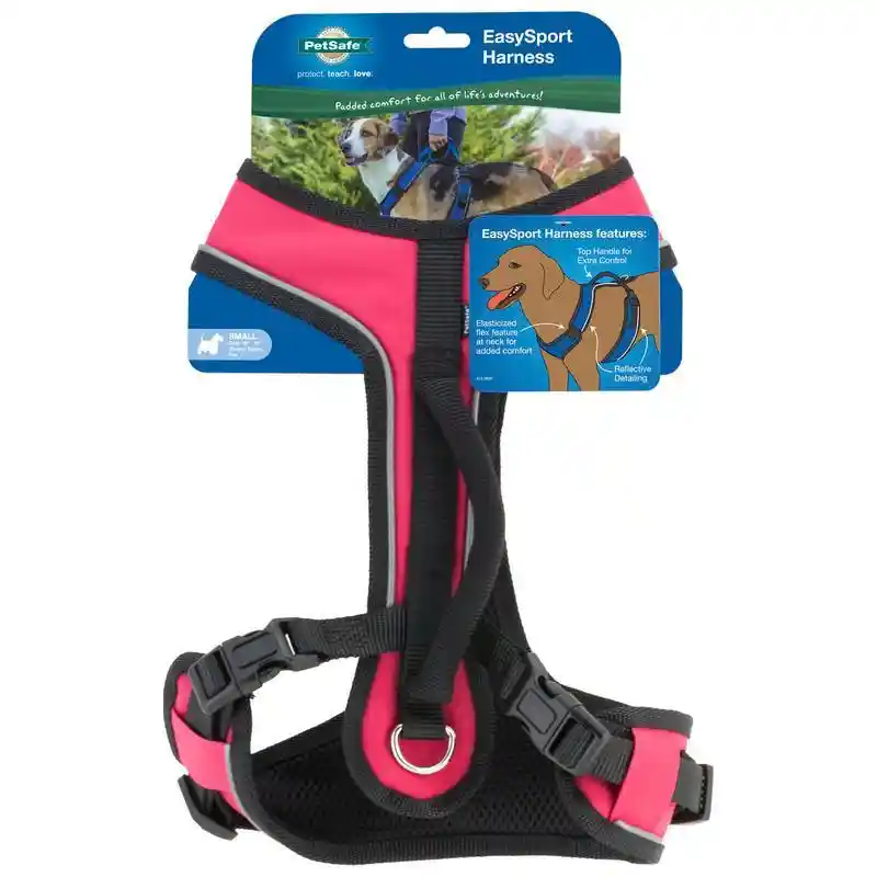 Give your dog comfort and style with the PetSafeยฎ EasySport Dog Harness. The fully adjustable EasySport Harness is padded throughout and features an elasticized neckline for a cozy fit. Two quick snap buckles make the harness easy to put on and remove, and the center back D-ring provides an easy to reach leash attachment. The convenient handle on top of the harness gives an extra degree of support when you need to control your dog quickly. Ideal for everyday wear, the PetSafeยฎ EasySport Harness lets your dog enjoy lifeโs adventures.