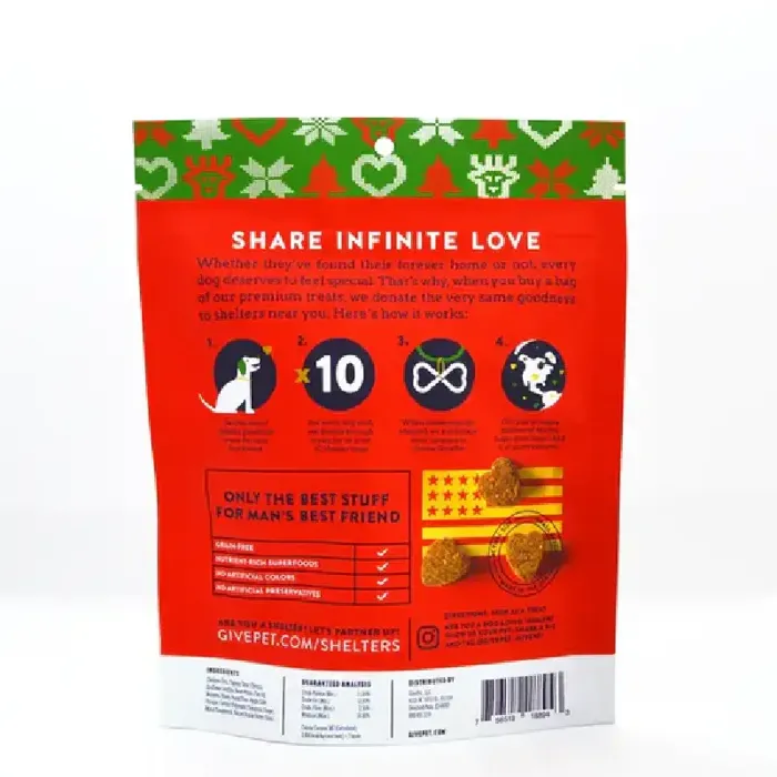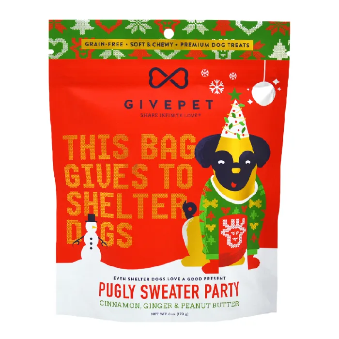 GivePet Pugly Sweater Party Cinnamon, Ginger & Peanut Butter Flavor Dog Treats go down just right for a dog during the holiday seasons. Natural ingredients combined with the soft and chewy texture make it grain-free and perfect for training, rewarding, or getting into the holiday spirit. In addition, each purchase helps spread some holiday cheer to shelter dogs, making the treats well thought out and savory.