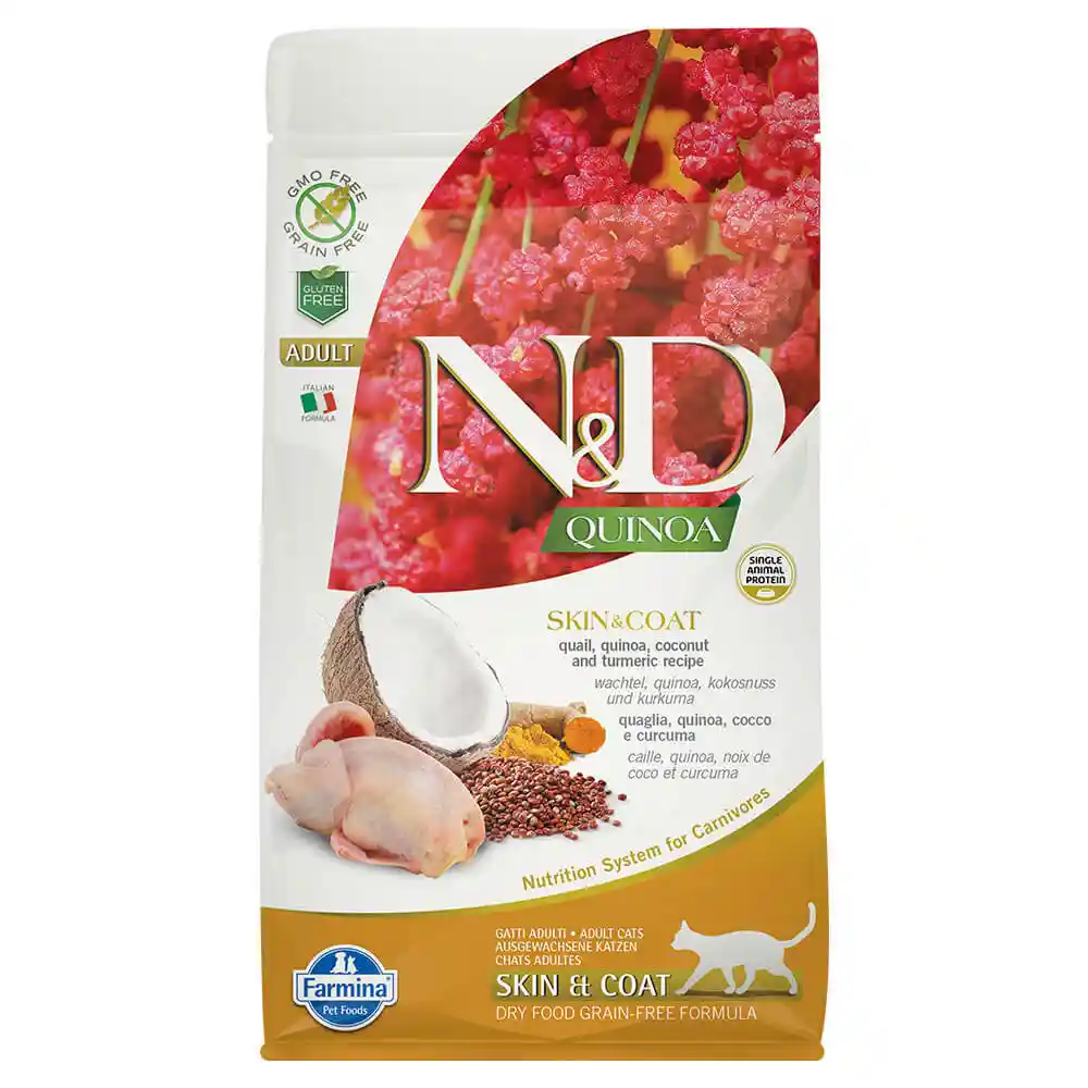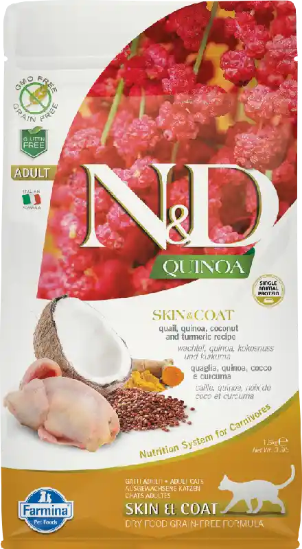 ALLERGIES? ITCHING? HOT SPOTS? N&D Quinoa Skin & Coat Quail Feline is a complete and balanced diet with 94% of the protein from animal source formulated to meet the nutritional levels for maintenance. A special functional L.I.D. formula designed for cats with food sensitivities/intolerances useful for restoring and maintaining skin and coat well-being. Made with Non-GMO and human-grade fresh (never frozen) ingredients like free-range quail, organic quinoa, coconut and turmeric. Low glycemic index, rich in zinc, high level omega 3 & 6 fatty acids, grain-free and gluten-free recipe with no legumes, potato, soy, meals, by-products, hormones, antibiotics, or artificial preservatives. Made with natural antioxidants, prebiotics and integrated additional taurine. All formulations are scientifically-proven and clinically-tested thru certified cruelty-free research. Guaranteed over 90% digestibility. THE ONLY KIBBLE FILLED WITH COLD INJECTED LIFE ESSENTIALS (dehydrated fruits and vegetables, botanicals, vitamins, and minerals are vacuum-infused cold-pressed into the kibble after cooking). Nitrogen filled bags to prevent the food from oxidation. All packaging is recyclable and BPA-Free.