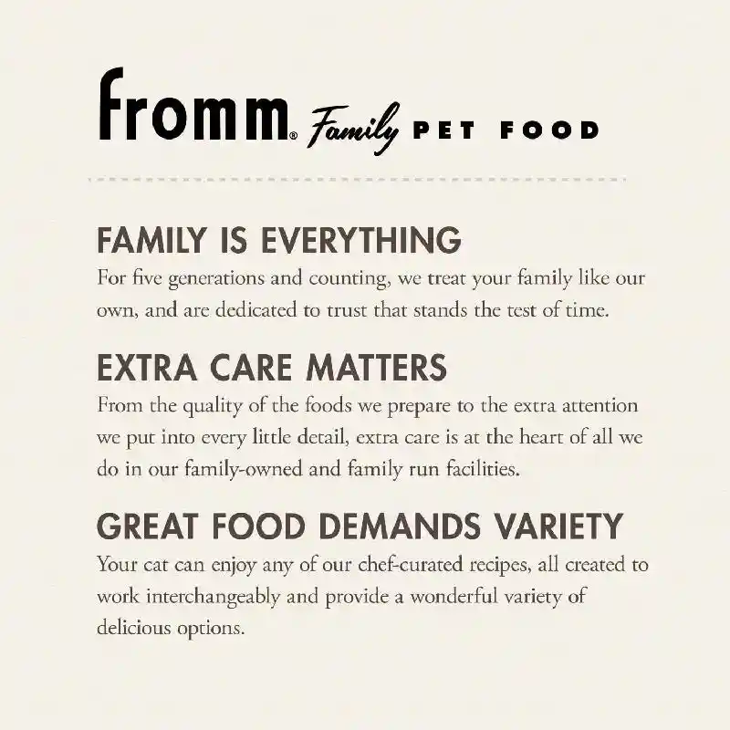 Fromm Four-Star Salmon ร La Vegยฎ Recipe is a delectable entrรฉe with salmon, fish broth, and liver. This recipe is specially prepared to ensure consistency, quality, and superior taste in each and every bowl. Salmon ร La Vegยฎ Recipe provides complete and balanced nutrition for cats of all ages and can be alternated with other Fromm Four-Star recipes.