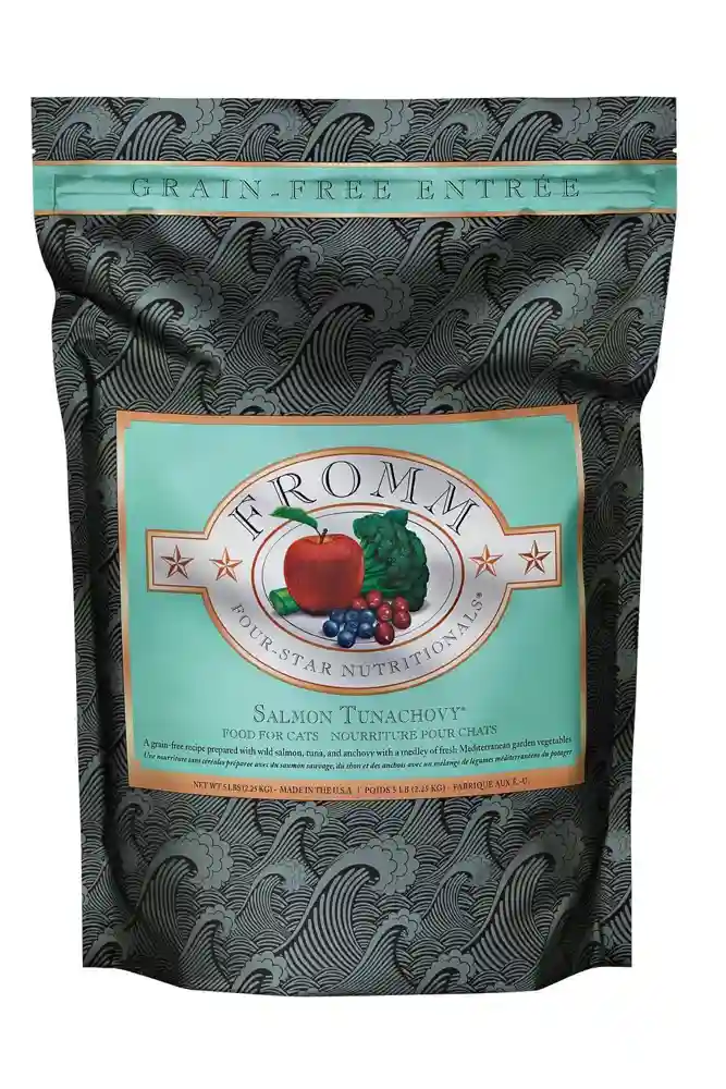 Fromm Four-Star Salmon Tunachovyยฎ Recipe is an enticing, grain-free entrรฉe with salmon, fish broth, tuna, and anchovy. This recipe is specially prepared to ensure consistency, quality, and superior taste in each and every bowl. Salmon Tunachovyยฎ Recipe provides complete and balanced nutrition for cats of all ages and can be alternated with other Fromm Four-Star recipes.