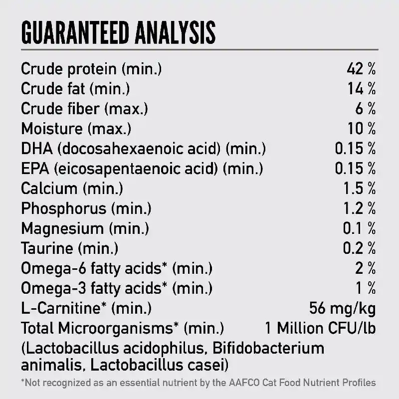 - Dry cat food offers a unique blend of soluble fibers, plus 44% protein from lean meats and 16% carbohydrates