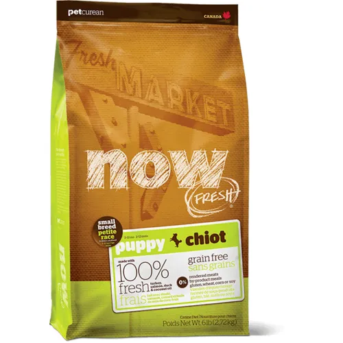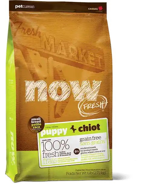 NOW FRESHโฐรฃยข Small Breed Puppy Recipe is made with 100% FRESH turkey, salmon, duck, and 100% fresh Omega 3 & 6 oils from coconuts and canola. NOW FRESHโฐรฃยข also features zero grains, gluten, wheat, beef, corn or soy. Zero rendered meats, by-products or artificial preservatives.