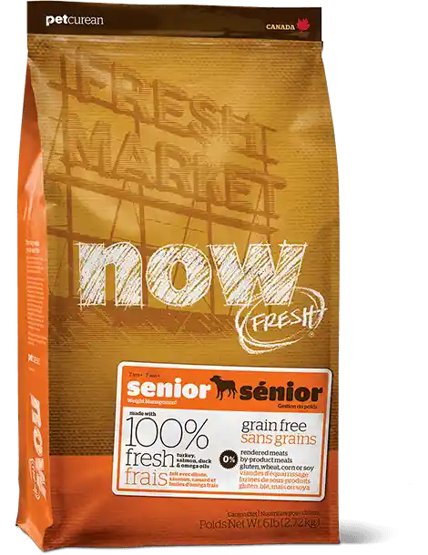 NOW FRESHโฐรฃยข Senior dog food recipe is made with 100% FRESH turkey, salmon, duck and 100% fresh Omega 3 & 6 oils from coconuts and canola. NOW FRESHโฐรฃยข also features zero grains, gluten, wheat, beef, corn or soy. Zero rendered meats, by-products or artificial preservatives.