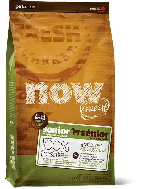 NOW FRESH Small Breed Senior Recipe is made with 100% FRESH turkey, salmon, duck, and 100% fresh Omega 3 & 6 oils from coconuts and canola. NOW FRESH also features zero grains, gluten, wheat, beef, corn or soy. Zero rendered meats, by-products or artificial preservatives.