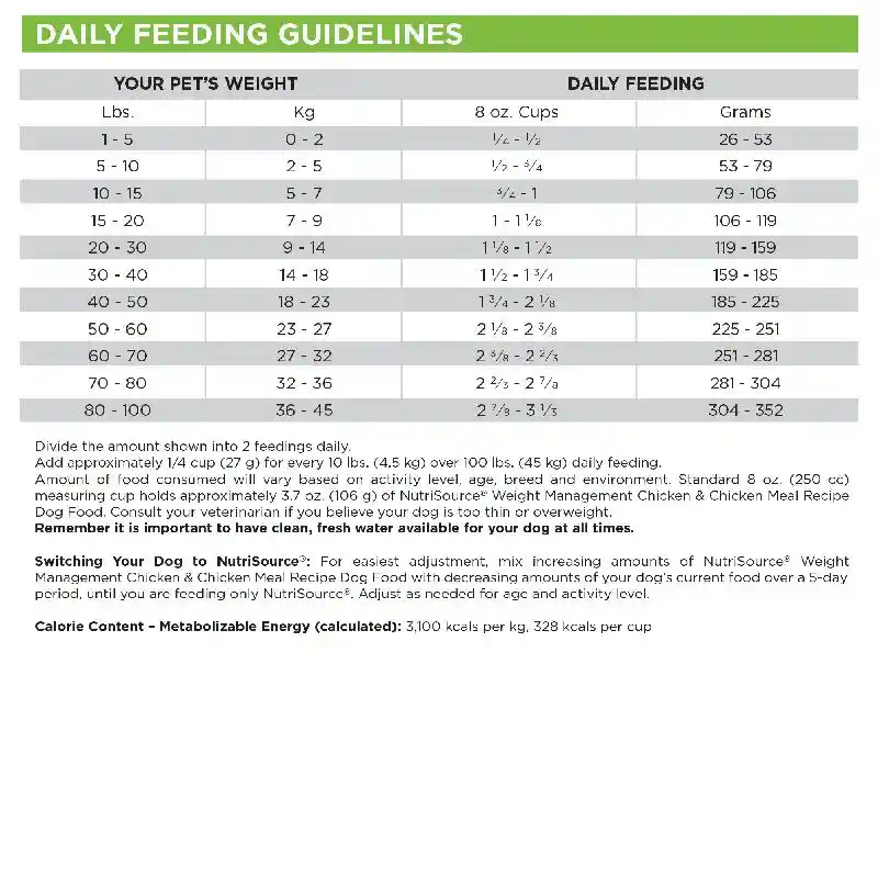 Made for heavier and less active pups, NutriSource Weight Management Chicken and Chicken Meal Dry Dog Food offers a low fat and easy to digest recipe. High quality ingredients like humane certified chicken are used in addition to the added chondroitin and glucosamine to help joints and mobility. NutriSource Weight Management Chicken and Chicken Meal Dry Dog Food also has higher amounts of fiber to help your pup feeling full, longer! Nutrisource recipes always include their Good 4 Life system with ingredients that work together to promote gut health often showing health improvements within the first feeding!