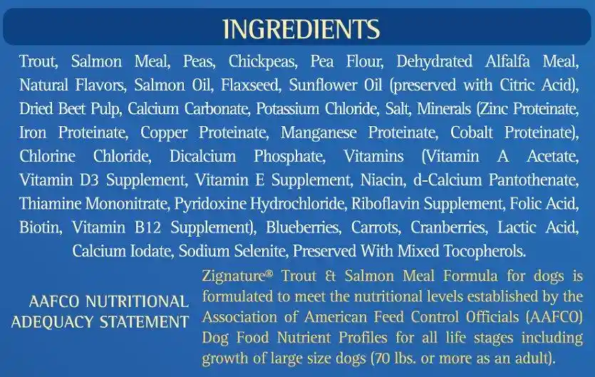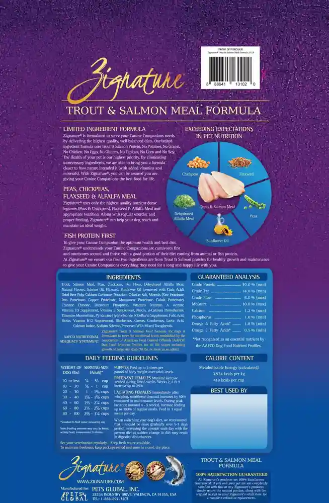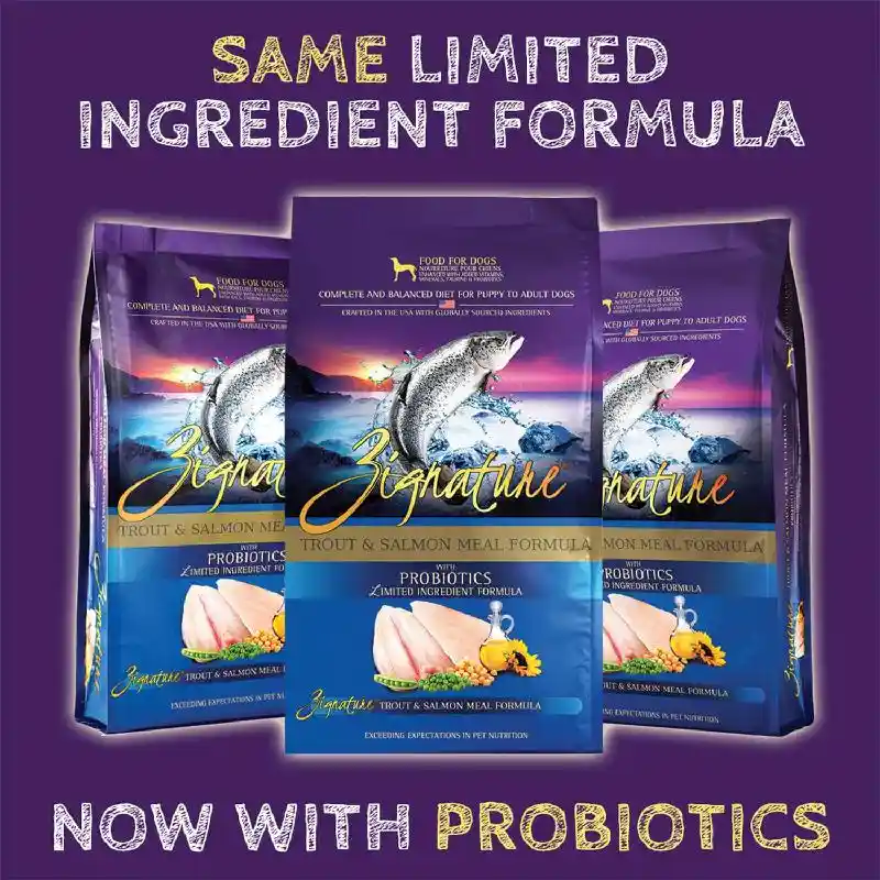 Fill your best friend's bowl with wholesome nutrition when you feed them Zignature Trout & Salmon Meal Limited Ingredient Formula Grain-Free Dry Dog Food. Your pup will enjoy a delicious dinner made with real Trout and Salmon from the Northwestern USA, wholesome peas, chickpeas, and flaxseed. This meat-first recipe offers pups the protein they need to thrive, while Zignature's limited ingredient recipe throws out troublesome ingredients like chicken, corn, wheat, soy, and potatoes, creating peak hypoallergenic, low-glycemic nutrition. Combine that with key antioxidants, essential fatty acids, and a complete spectrum of vitamins and minerals for a well-rounded meal that goes beyond nature to become your pet's signature food for life.