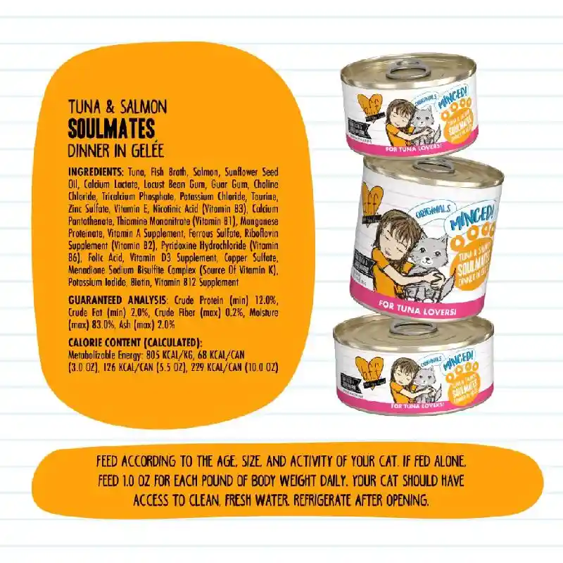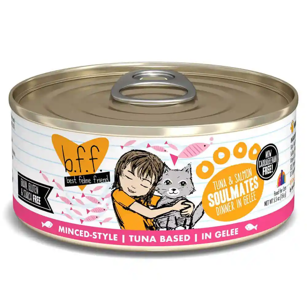 Grab the best food for your Best Feline Friend with the BFF Tuna and Salmon Soulmates Canned Cat Food. The BFF canned food is always packed full of high-quality proteins and limited carbohydrates processed in a human grade facility. These wholesome canned cat foods are all made with delicious red meat proteins and low fat guaranteed to be your pet's food soul mate. The BFF Tuna and Salmon Soulmates Canned Cat Food are primarily made of wild-caught tuna and salmon which is both dolphin and turtle-safe! BFF Canned foods are also Grain Free and BPA free for a happy and healthy kitty.